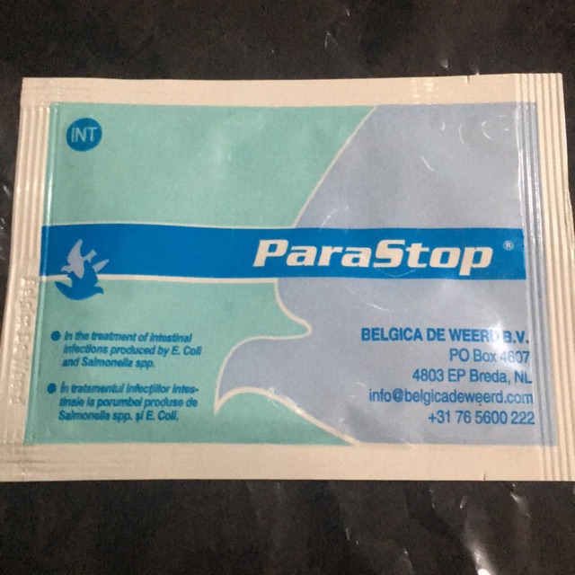 Al meer dan 20 jaar heeft Parastop bewezen een van zo niet de beste behandelingen tegen Salmonella. This combination drug has proven its ultra-high reliability for more than 20 yearsEnsure first-class moulting and extra bloom and new feather condition. Pigeons and Birds Parastop against paratyphoid Salmonellosis.